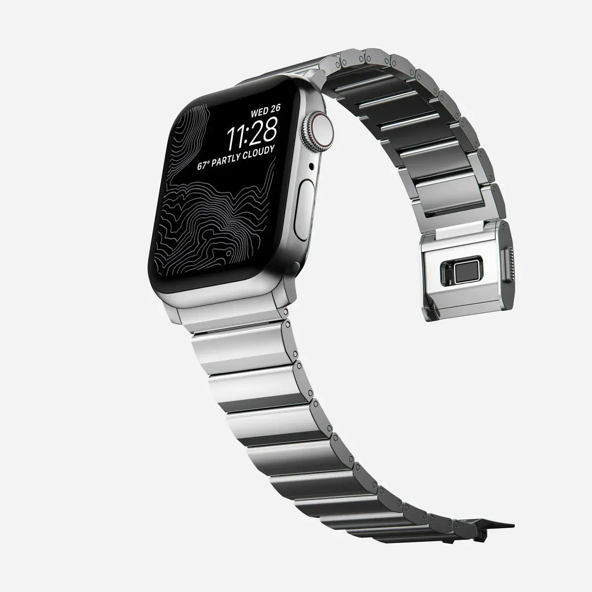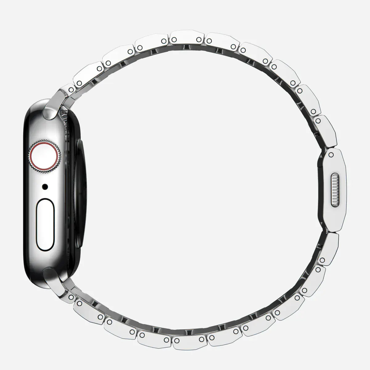 Конструкція ремінця натхненна традиційними годинниковими браслетами з ланками, які можна точно відрегулювати під зап’ястя. Інтегровані кріплення створюють цілісний вигляд з Apple Watch, а мінімалістичний стиль підкреслює преміальний характер аксесуара.